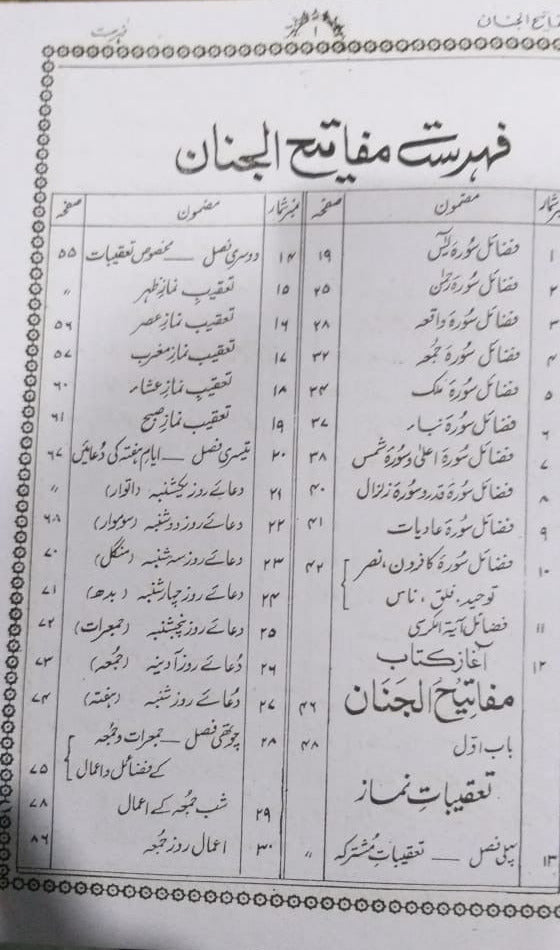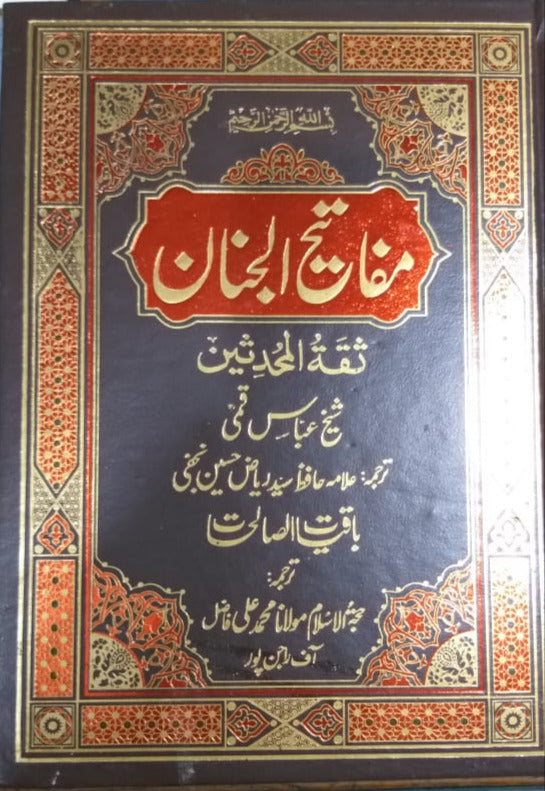 Mafatih al-Jinan (Arabic: مفاتيح الجنان, lit. 'Keys to heaven') by Sheikh Abbas Qumi, is a Twelver Shi'a compilation of Qur'anic Chapters, Dua's, Taaqeebat (acts of worship after daily prayers), acts during Islamic months and days, supplications narrated from the Ahl al-Bayt and the text of Ziyarats