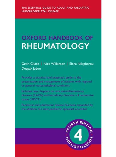 The fourth edition of Oxford Handbook of Rheumatology has been fully reviewed and practically structured. There is a comprehensive and updated account of assessment, guidelines, and treatment options. It focuses on presenting symptoms and considers key diseases, emergencies, and rare diseases in detail. It includes new chapters on rare autoinflammatory diseases (RAIDs) and hereditary disorders of connective tissue (HDCT) making this an invaluable guide for the trainee doctors and consultant rheumatologists.
